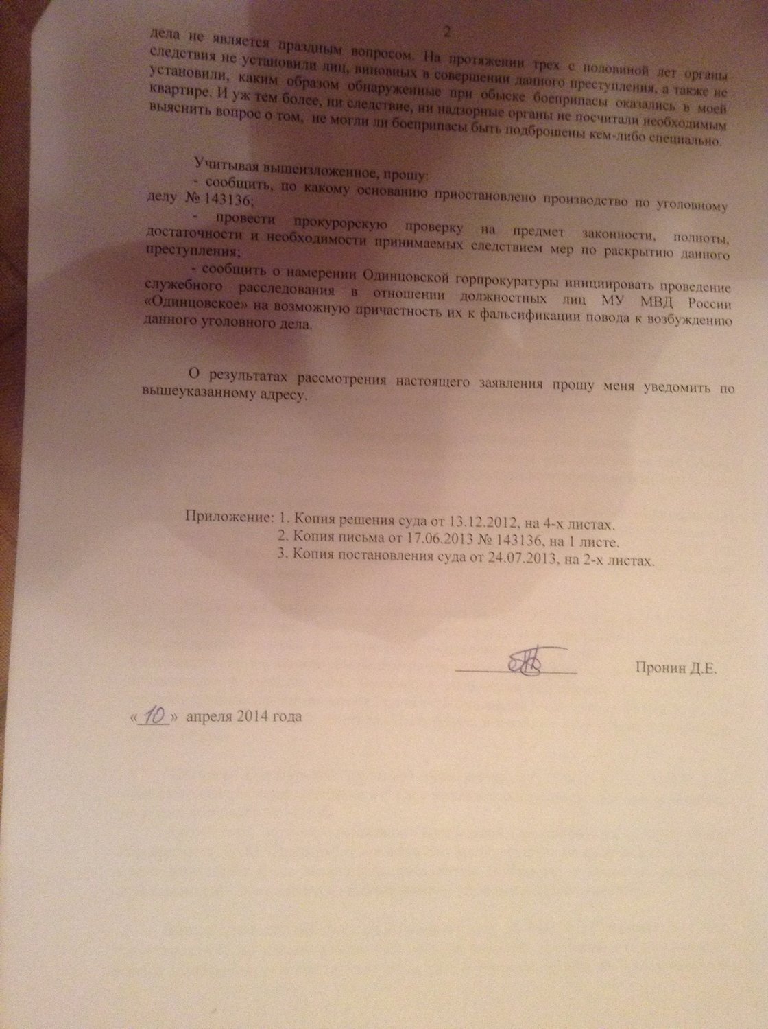 Отправлено 04 февраля 2015 в 10:54 — Заявление в Одинцовский городской суд, члена ОНК МО Пронина Д. Е. на Одинцовскую прокуратуру Изображения Редактировалось 2 раз (а), последний раз