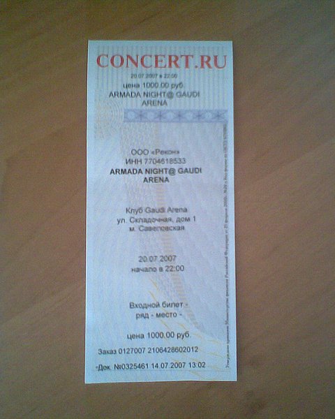 Отправлено 20 июля 2007 в 18:08 — Все, ребятки, погнал я в Гауди на Армина ван Бьюрена! Вот фота билета: ![]() Позже ждите весь фотоотчет! | ||||