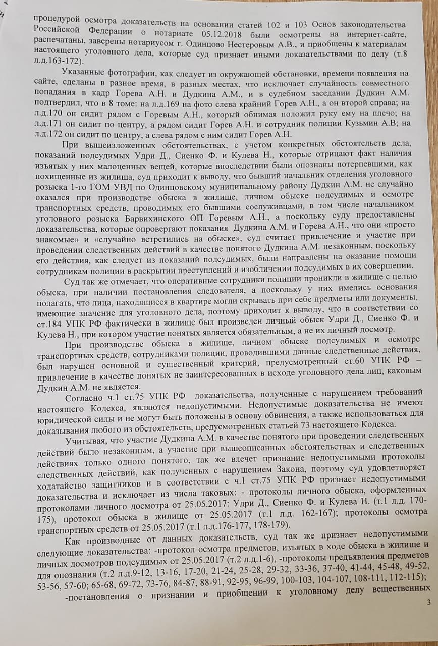 Отправлено 19 августа 2019 в 08:14 — Генеральная прокуратура; СКР; УСБ МВД Заявление о преступлении В порядке ст.141 УПК РФ Мне стало известно, что два года назад у одних весьма богатых людей на Рублево-Успенском шоссе обокрали дом. Было возбуждено уголовное дело номер 11701460026001105. Камеры у дома ничего особо не записали, но при отработке камер в окрестностях поселка полицейские обратили внимание на одну машину, которая останавливалась у магазина. Её водитель был россиянин молдавского происхождения по фамилии Удря. Его отсчитали, установили адрес и решили провести обыск. Ночью, начальник Барвихинского ОУР Горев (на всех фотографиях отмечен красной стрелкой) и еще несколько человек-полицейских, взяв с собой двух заранее приглашенных людей в качестве понятых приехали в адрес, в Путилково. В эту ночь к Удре в квартиру приехали гости два земляка и дальних родственника. Одному нужно было где-то остановиться (он недавно приехал из Молдавии), второй собирался в церковь ему было ближе ехать. Вечером Удря уехал к своей девушке и вернулся ночью. По возвращению домой его задержали в подъезде и открыли квартиру его ключами, где спали другие двое Кулев и Сиенко. И они как обычные нормальные люди спали в трусах, а не верхней одежде. Всех находящихся в квартире жёстко положили на пол, после чего заставили одеться, а потом в лучших традициях Одинцовской полиции накинули на голову одеяло и подкинули в карманы всяческих вещей. Сразу после этого их по одному отводили на кухню, где при понятых доставали из карманов вещи и записывали в протокол. Поскольку все задержанные начали отрицать свою причастность к преступлению и говорить о том, что им это всё подкинули, то им просто не стали давать возможность написать это в протоколе, а указали что они якобы от подписи отказались. Далее: 1. Понятые не были приглашены из числа соседей, а были привезены из Барвихи. Типа они ночью прогуливались, к ним подошли сотрудники полиции и попросили помочь. Но дело в том, что одним из этих случайных людей, оказался Дудкин Алексей (на всех фотографиях отмечен жёлтой стрелкой), который ранее работал начальником ОУР 1-го Одинцовского ГОМ, был судим за мошенничество с использованием служебного положения (не доказали взятку). Мало того, что Дудкин и Горев являлись начальниками отделений одного отдела УР нашего родного Одинцовского района, но они хорошо знали друг друга, о чём доказывают фотографии, где они совместно проводят время, выпивая спиртные напитки. Приговор на понятого Дудкина и фото с операми имеются в уголовном деле номер 11701460026001105. Дудкин заявлял, что Горева не знает и ни когда с ним не общался. Второй понятой тоже житель района, на фото в соцсетях он в форме сотрудника полиции (сказала, что дурачилась), фамилия совпадает с фамилией следователя, которая лет 20 назад работала в Одинцовском СУ. 2. Задержанным подкинули вещи с ТРЕХ краж. Но кражи эти произошли в период с февраля по май 2017г. То есть, злодеи-мужики несколько месяцев носили у себя в карманах женское зеркальце, серьги, бижутерию, закладку от книги и тому подобные вещи, но это абсурд. Тем более, что эти вещи не были указаны в числе похищенного потерпевшими. Только позже (скорее всего допросы с кривыми датами) потерпевшие вспомнили, что эти вещи у них тоже похитили. Все обнаруженное не имеет ценности. 3. Со слов задержанных люд