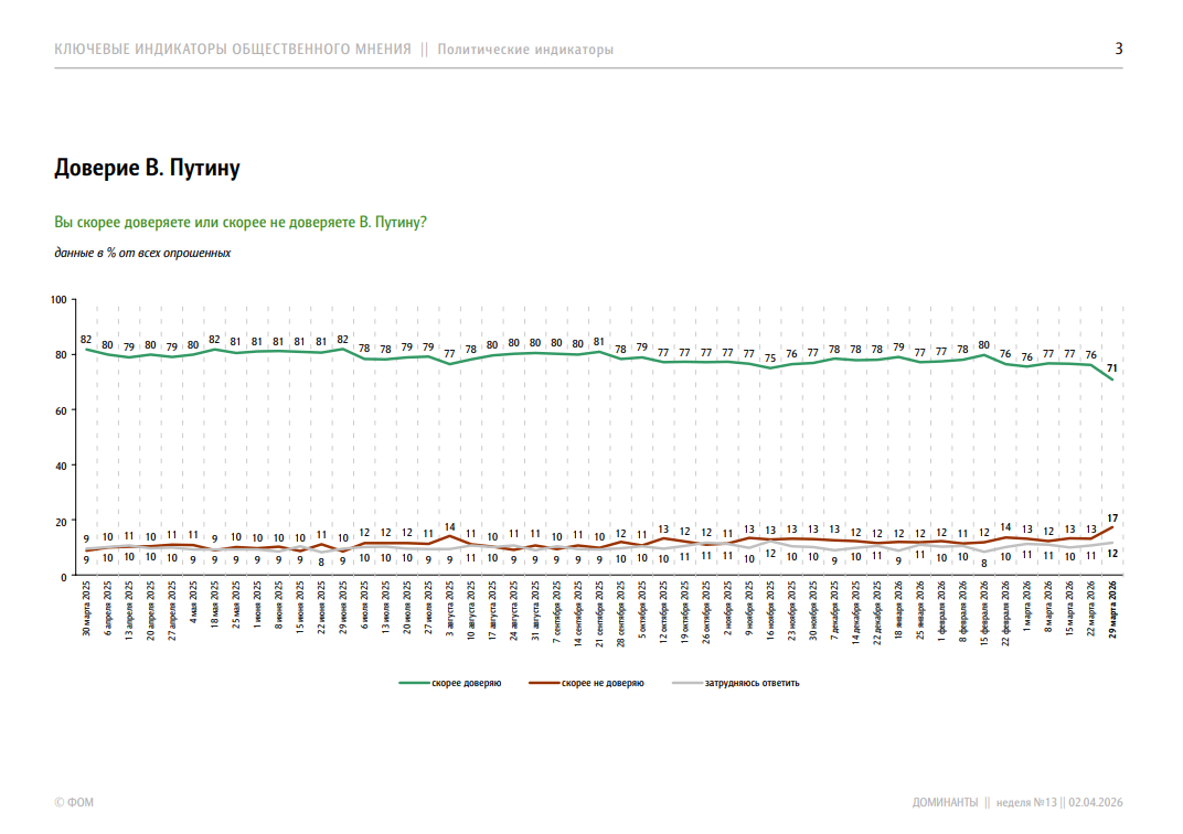 Количество россиян, заявляющих о доверии к Владимиру Путину, за прошлую неделю (с 22 по 29 марта) сократилось на 5 процентных пунктов (п. п.) — с 76% до 71%, что стало самым низким показателем за год, свидетельствуют данные социологического опроса Фонда «Общественное мнение» (ФОМ), проведенного 27-29 марта.