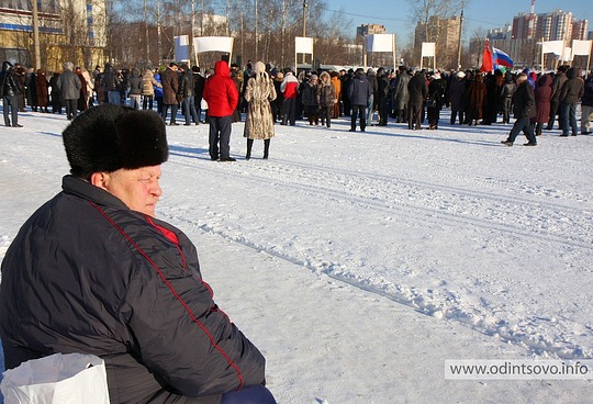 Молодежь, в основном, толпилась в задних рядах и по бокам от сцены. На вопрос одному из участников митинга, почему не проходит вперед, ближе к событиям, тот честно признался: «Мне стыдно быть здесь». И попросил его не фотографировать — он не хочет, чтобы его снимок попал на сайт, и о том, что поддерживал Путина, узнали его знакомые. Парень рассказал, что работников муниципальных предприятий, а также сотрудников администраций городских и сельских поселений Одинцовского района на митинг пригнали по разнарядке. «Некоторые у нас смогли отмазаться, а я не смог. Если бы отказался участвовать в этом, меня могли уволить», — признался митингующий.