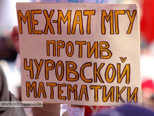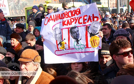 Среди митингующих были замечены и одинцовцы, которые несли плакат «Одинцовская карусель» с портретами МЕДВЕДЕВА и ПУТИНА, а также транспарант «Одинцово за честные выборы».