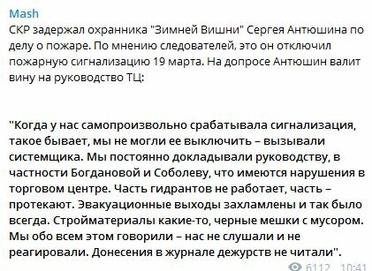 «… Бастрыкин подчеркнул, что во время пожара охранник не включил систему оповещения, которая была исправна. Глава ведомства признался, что не может объяснить его решения, по его словам, охранник был неподготовленным человеком» — из новостей.