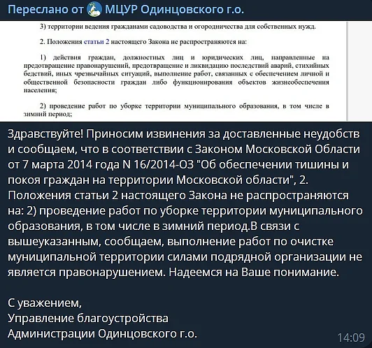 «Положения областного закона о тишине не распространяются на уборку территории»: ответ управления благоустройства администрации Одинцовского округа