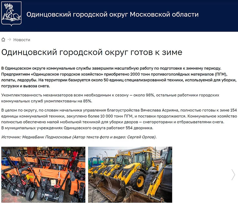«Одинцовский городской округ готов к зиме» — сообщение на сайте администрации муниципалитета