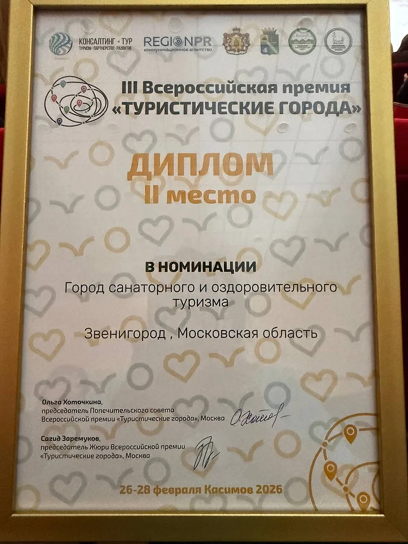 Звенигород стал лауреатом Всероссийской премии «Туристические города», диплом за второе место