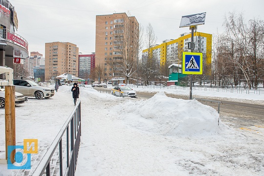 Снежный бруствер на тротуаре, улица Чикина, 8А