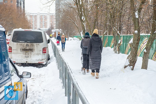 Снежный бруствер на тротуаре, улица Чикина, 3А
