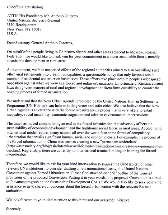 Проект конвенции ООН против насильственной урбанизации, предлагаемый жителями Одинцовского района