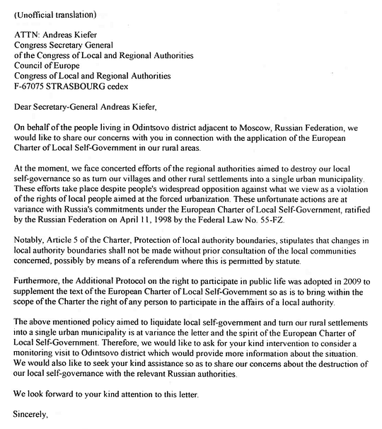 Текст обращения жителей Одинцовского района в Совет Европы на английском языке