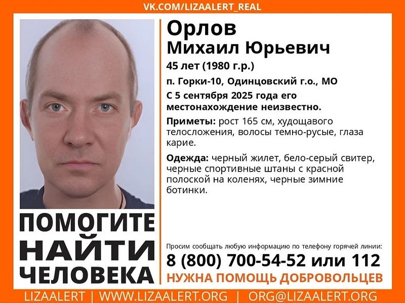 В Одинцовском округе ищут 45-летнего Михаила Юрьевича Орлова из посёлка Горки-10