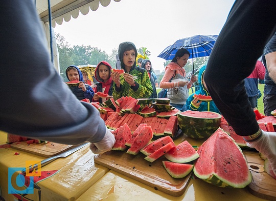 На территории парка нет мест, чтобы укрыться от дождя. Люди стояли под аркой, мешая входу и выходу на стартовую поляну