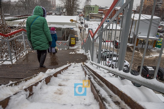 Заледеневшие ступеньки на пешеходном мосту у станции Одинцово