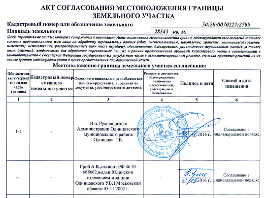 Акт согласования местоположения границ земельного участка 50:20:0070227:2705 подписан и. о. руководителя. Администрации Одинцовского района Одинцовой Т. В.