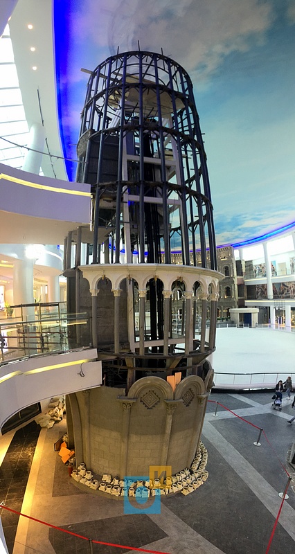 Лифт внутри Пизанской башни, фонтан, каток и сцена в виде Колизея