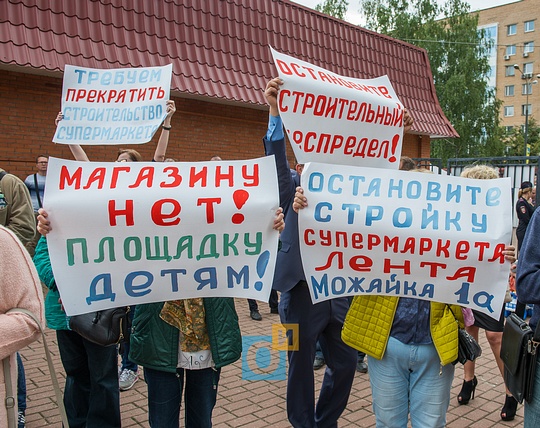 Требуем прекратить строительство супермаркета!; Магазину НЕТ! Площадку детям!; Остановите строительный беспредел!; Остановите стройку супермаркета Лента Можайка 1а