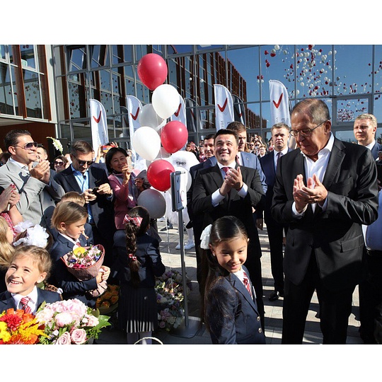 1 сентября 2017 года, открытие Гимназии имени Е. М. Примакова в Раздорах. Андрей Воробьёв, Сергей Лавров, Майя Майсурадзе, Андрей Иванов, Евгений Сандро, Ольга Забралова