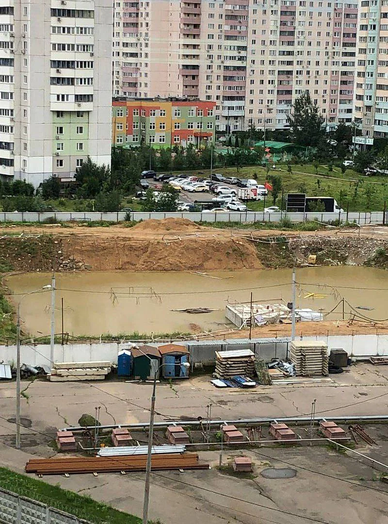 Стройплощадка поликлиники в Трёхгорке превратилась в бассейн с грязной водой
