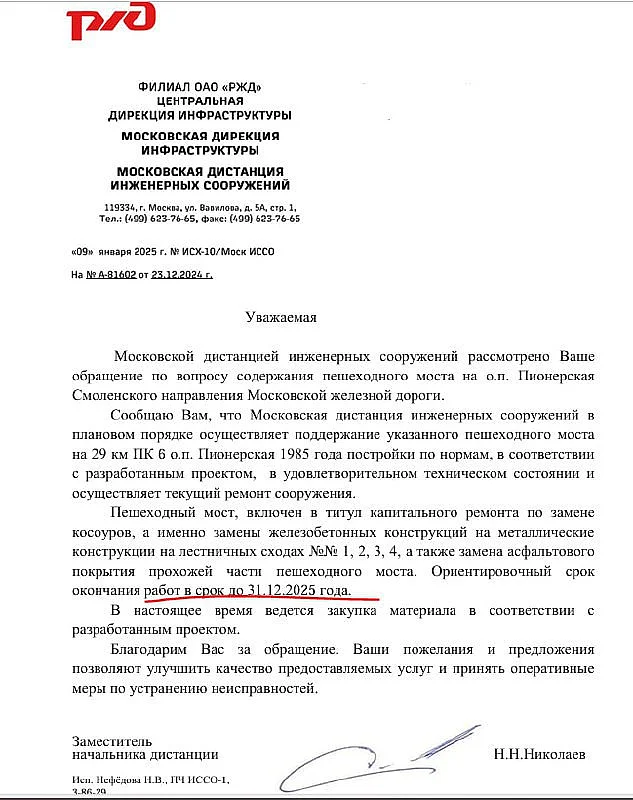 Ответ из РЖД по ремонт пешеходного моста на железнодорожной станции «Пионерская» в Одинцовском округе