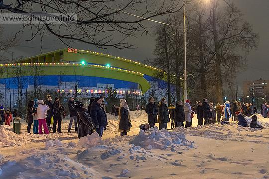 Жители Одинцово наблюдают пиротехническое шоу на центральной площади в новогоднюю ночь