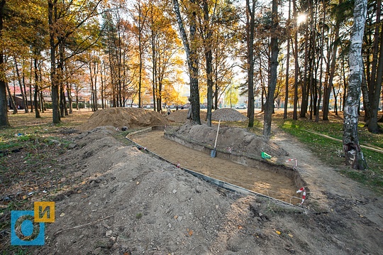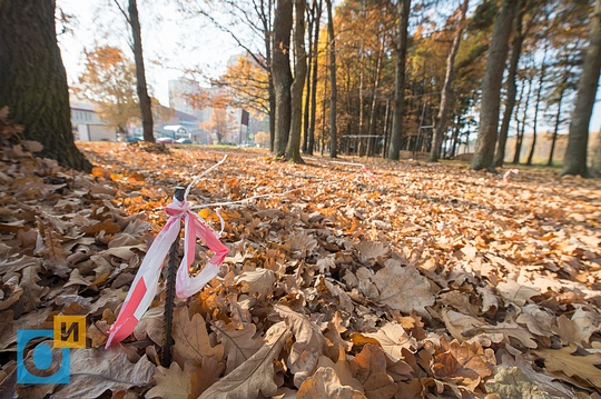 Границы будущих пешеходных дорожек обозначены кусками арматуры и маркерной лентой