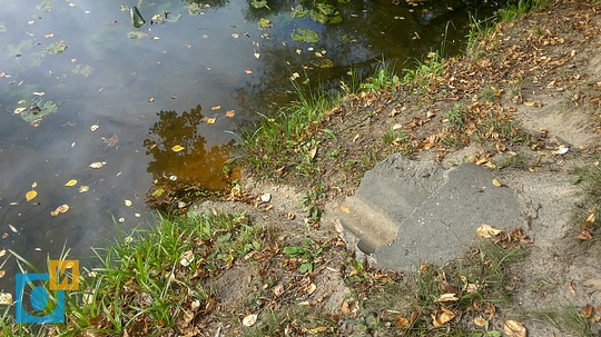 Большой Немчиновский пруд, ещё одна труба из частного сектора, которую зацементировали, уже образовалась протечка