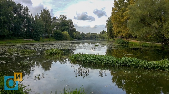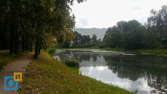 Большой Немчиновский пруд, перед коллектором в р. Чаченка поверхность воды покрыта пленкой и маслянистыми пятнами