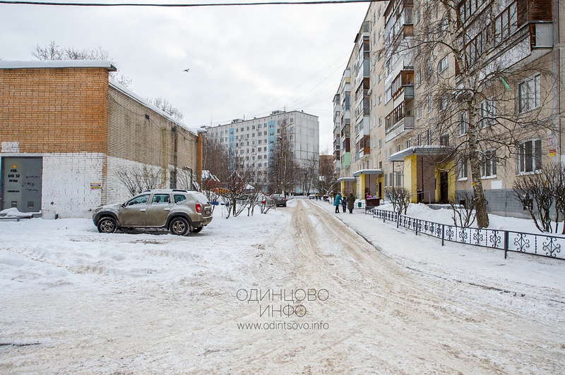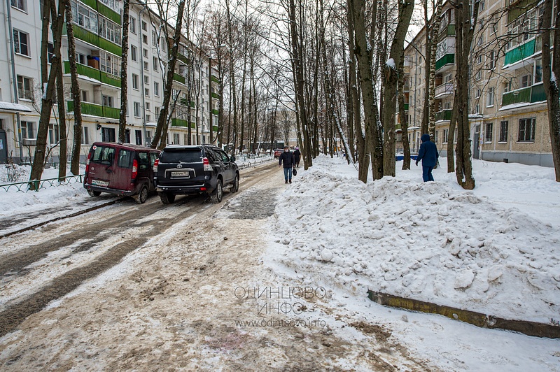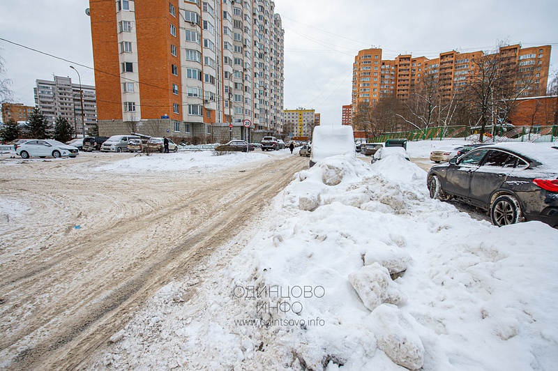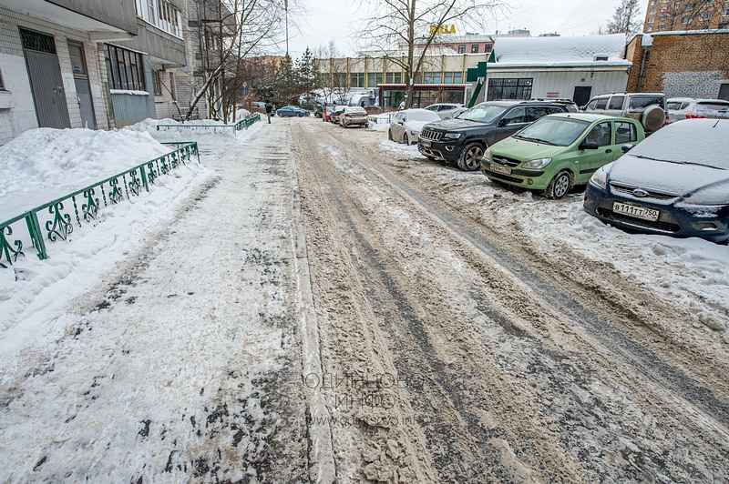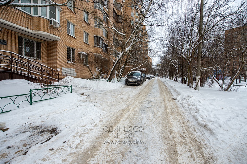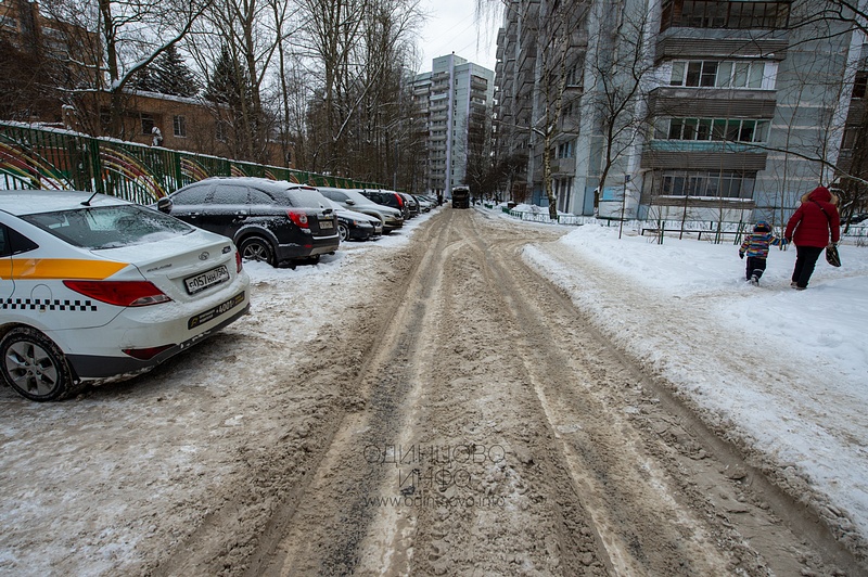 Не расчищенная проезжая часть у дома по Можайскому шоссе №99, со стороны входа в подъезды