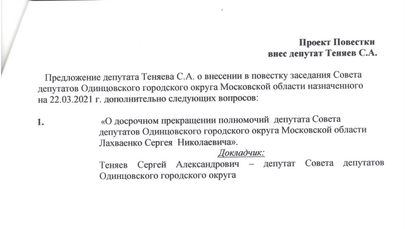 Предложение Теняева по повестке заседания совета депутатов 22 марта